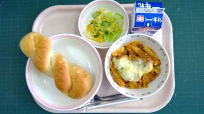 ミルクパン、ペンネのミートソースグラタン、コーンサラダ、牛乳