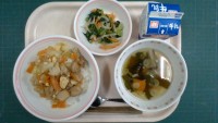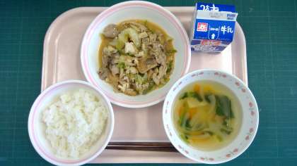ご飯、豚肉と厚揚げのみそ炒め、野菜のすまし汁、牛乳
