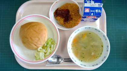 丸パン、チキン勝ツ、ボイルキャベツ、ABCスープ、牛乳
