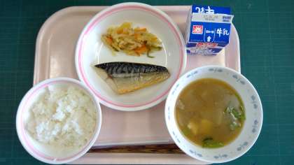 ご飯、さばの文化干し、じゃがいものせん切り炒め、具だくさんみそ汁、牛乳