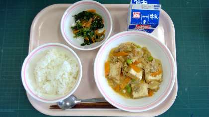 ごはん、ジャーチャン豆腐、ナムル、牛乳