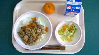かみかみごまだれ丼、浅漬け、冷凍みかん、牛乳