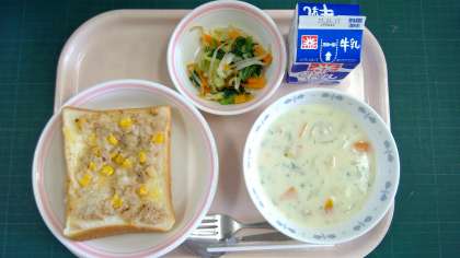 ツナコーントースト、ミルクスープ、野菜サラダ、牛乳