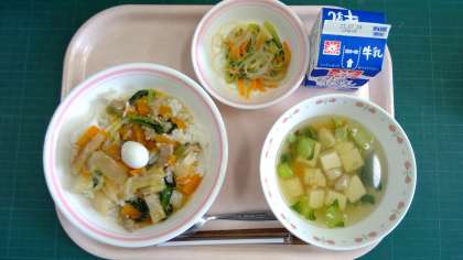 中華丼、春雨サラダ、チンゲン菜のスープ、牛乳