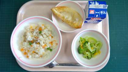 ピラフ、ツナとポテトのパリッと揚げ、ブロッコリーとコーンのサラダ、牛乳