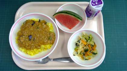 夏野菜のキーマカレー、野菜サラダ、すいか、ジョア