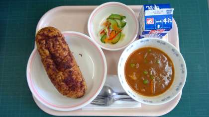 ココア揚げパン、トマトシチュー、フレンチサラダ、牛乳