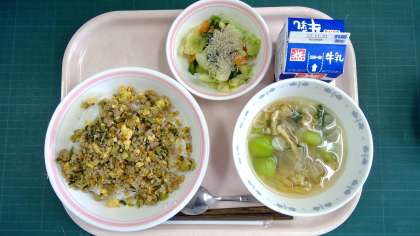 高菜そぼろ丼、じゃこサラダ、野菜のすまし汁、牛乳