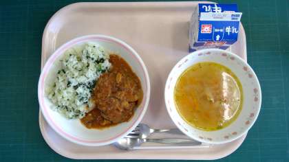 ポパイライス、ハチのふるさとハンバーグ、キャロットスープ、牛乳