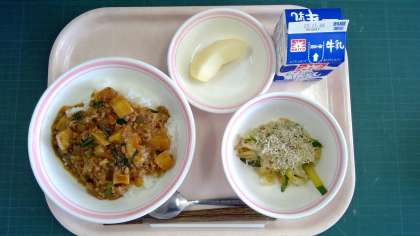 マーボーじゃが丼、もやしとじゃこのサラダ、りんごかもしれない、牛乳