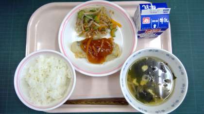 ご飯、たらの中華あんかけ、こんにゃくサラダ、わかめスープ、ぎゅうにゅう