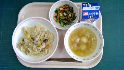 秋の香りご飯、ひじきと大豆の和え物、ふんわり豆腐団子スープ、牛乳