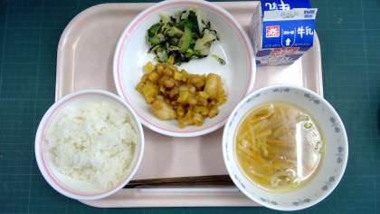 ごはん、いかとさつま芋の甘辛揚げ、磯和え、沢煮椀、牛乳