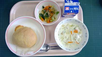給食のメロンパン、野菜サラダ、ミルクスープ、牛乳