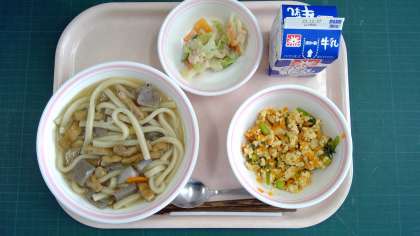 けんちんうどん、ツナマヨサラダ、炒り豆腐、牛乳