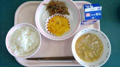 ご飯、親子焼き、きんぴらごぼう、生揚げのみそ汁、牛乳