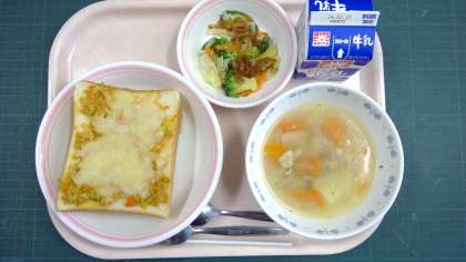 チキンカレートースト、カリカリベーコンのサラダ、ABCスープ、牛乳