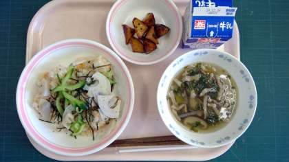 鮭ばら寿司、沢煮椀、大学芋、牛乳
