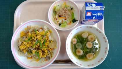 五目ずし、切干大根とツナの和え物、お麩のすまし汁、牛乳