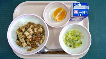 マーボー丼、野菜の塩ナムル、デコポン、牛乳