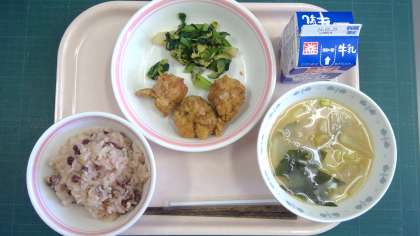 お赤飯、鶏のから揚げ、磯和え、野菜のみそ汁、牛乳