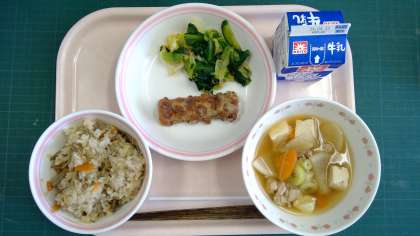 きんぴらご飯、ちくわのゆかり揚げ、野菜のおかか和え、けんちん汁、牛乳
