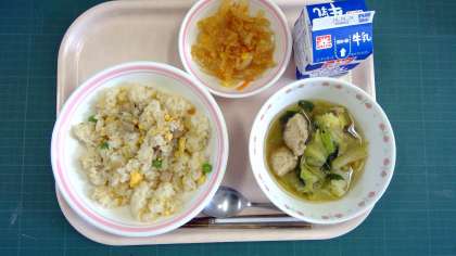 チャーハン、春キャベツと肉団子のスープ、中華風パリパリサラダ、牛乳