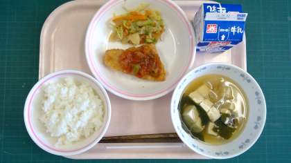 ごはん、いかのチリソース、何でもせん切りサラダ、わかめスープ、牛乳