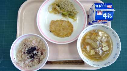 お赤飯、つくね焼き、もやしとじゃこのサラダ、のっぺい汁、牛乳