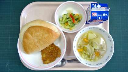 タンドリーチキンサンド、フレンチサラダ、ポトフ、牛乳