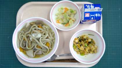 けんちんうどん、炒り豆腐、ツナマヨサラダ、牛乳