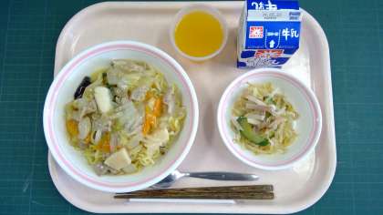 あんかけ焼きそば、中華風サラダ、オレンジゼリー、牛乳