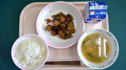 ごはん、さわらと野菜の黒酢あんかけ、大根のみそ汁、牛乳
