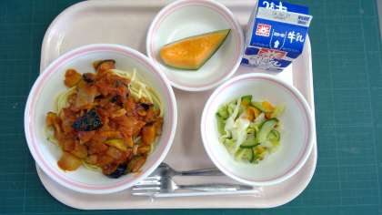 夏野菜のトマトスパゲッティ、フレンチサラダ、メロン、牛乳