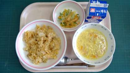 キムチチャーハン、中華風パリパリサラダ、中華コーンスープ、牛乳