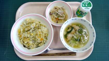 野沢菜とじゃこのチャーハン、白菜と肉団子のスープ、春雨サラダ、ジョア