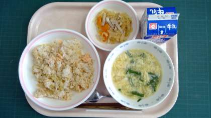 さけとキャベツのチャーハン、切干大根のナムル、にら玉スープ、牛乳