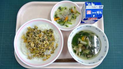 高菜そぼろ丼、じゃこサラダ、野菜のすまし汁、牛乳