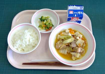 ご飯、ぶた肉のすき焼き煮、ごまドレッシングサラダ、牛乳