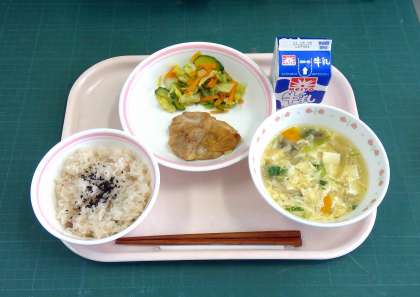 お赤飯、鶏肉の香味焼き、キャベツの甘酢和え、かきたま汁、牛乳
