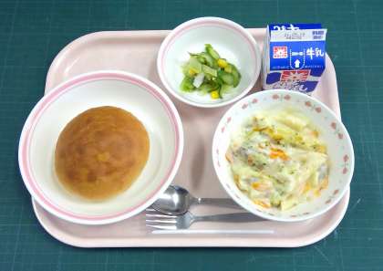 丸パン、ペンネグラタン、アスパラサラダ、牛乳