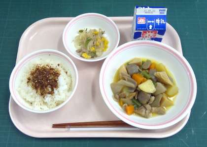 ご飯、かつお節のふりかけ、筑前煮、春雨炒め、牛乳