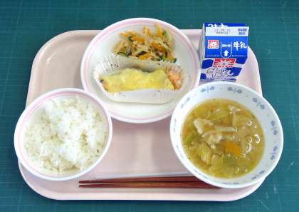 ご飯、白雲のせサーモン、切り干し大根のサラダ、キャベツのスープ、牛乳