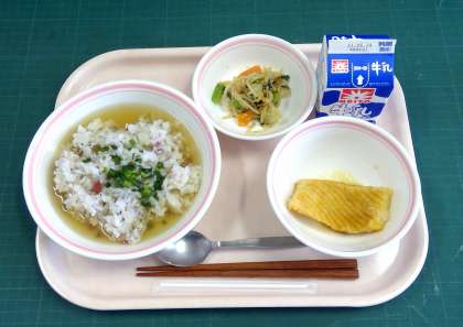 梅茶漬け、いかのかりん揚げ、ごま和え、牛乳