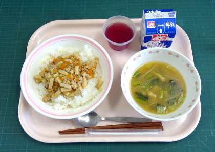 【今日の給食】5月18日(火) 公開日 2021/05/18 更新日 2021/05/18 給食だより 高野豆腐のそぼろ丼、もやしの味噌汁、ブドウゼリー、牛乳 〈産地〉 とりにく:北海道 にんじん:徳島県 たまねぎ:佐賀県 しょうが:高知県 もやし:栃木県 じゃがいも:鹿児島県 こまつな:東京都