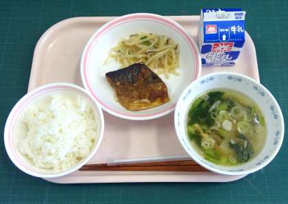 ご飯、さばのごまみそ焼き、じゃがいもの千切り炒め、大根のすまし汁、牛乳