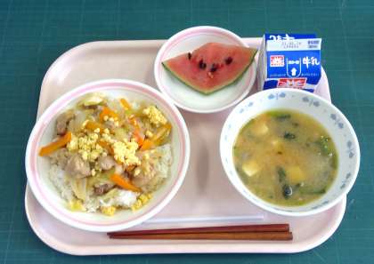 焼き鳥丼、豚汁、小玉スイカ、牛乳