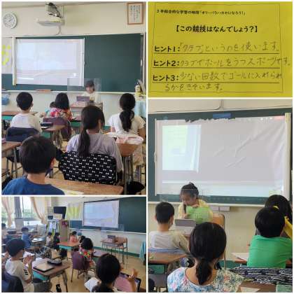 3年生総合的な学習の時間 公開日 2021/06/25 更新日 2021/06/25 学校の様子 午前中は、水泳の授業を行いました。 午後は、総合的な学習の時間でオリパラ博士報告会を行いました。タブレットを使い、生中継で1組2組両方の発表を聞きました。みんなとても上手に発表ができました。