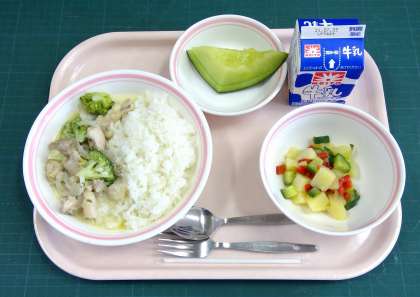 鶏もも肉のグレモラータ仕立て、イタリア風マセドアンサラダ、メロン、牛乳