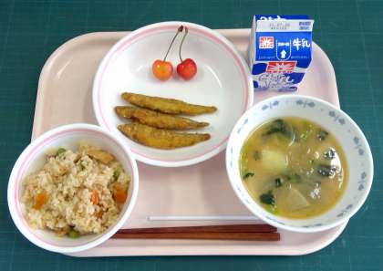 五目ご飯、野菜の味噌汁、わかさぎのカレー揚げ、さくらんぼ、牛乳